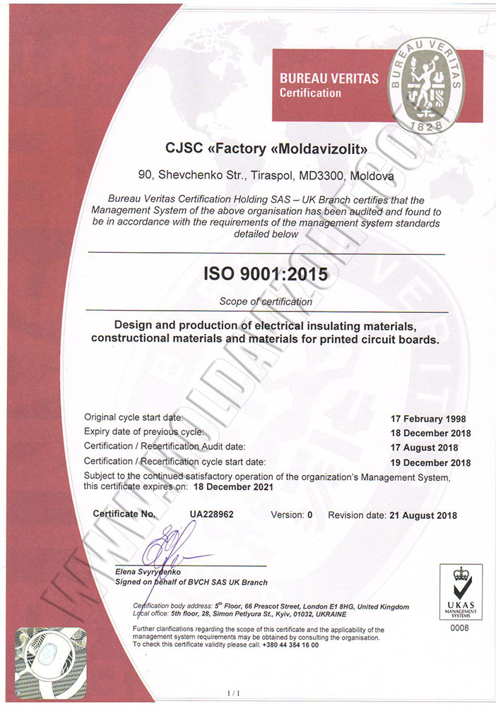 This system, in February 1998 has been certified by the international the certification body BVQI (Bureau Veritas Quality International). In December 2006, the company has once again successfully passed the certification of international organizations «BUREAU VERITAS Certification» and today quality management system of JSC "Factory" Moldavizolit "" complies with international standard ISO 9001:2008 (Certificate №151002511774 on 06 june 2025 ).